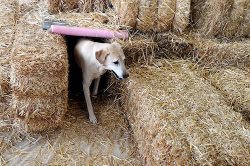 Barn Hunt is open to dogs of any age or breed. They are required to climb a bale of hay and maneuver through tunnels that are bail high.